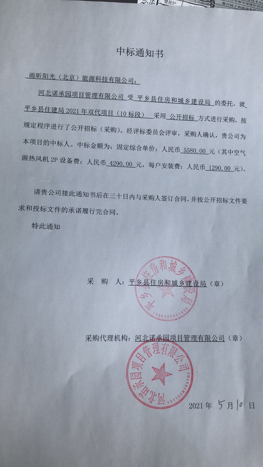 2021年,河北省煤改清潔能源行動再次重啟。近日,河北邢臺平鄉縣住建局2021年雙代項目開標,雨昕陽光再傳捷報,成功中標。項目類型為變頻熱風機供熱采暖系統,公司已做好充分準備,將全力以赴為河北“煤改電”項目繼續貢獻自己的一份力量,為廣大民眾帶去了溫暖舒適的冬季采暖服務。