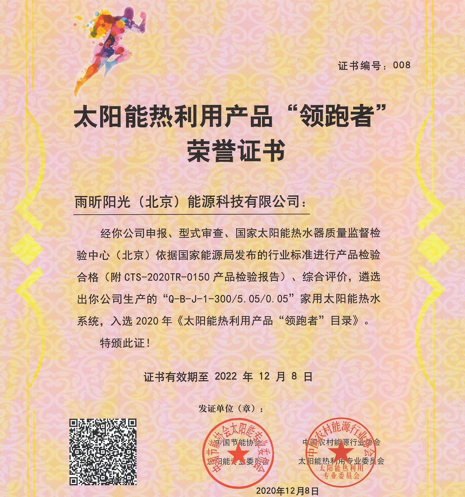 無菌承壓無動力太陽能是雨昕陽光公司在2010年在行業率先推出的一款創新產品,先后通過國家太陽能熱水器檢測中心檢測,榮獲“北京市創新產品(服務)認證”等多項榮譽,該款產品為即熱式承壓供水產品,擁有“零污染、可飲用”,“零能耗供水”,“靜音高效”“不占用設備間”“冷熱水壓力平衡,不忽冷忽熱”等多項優點。