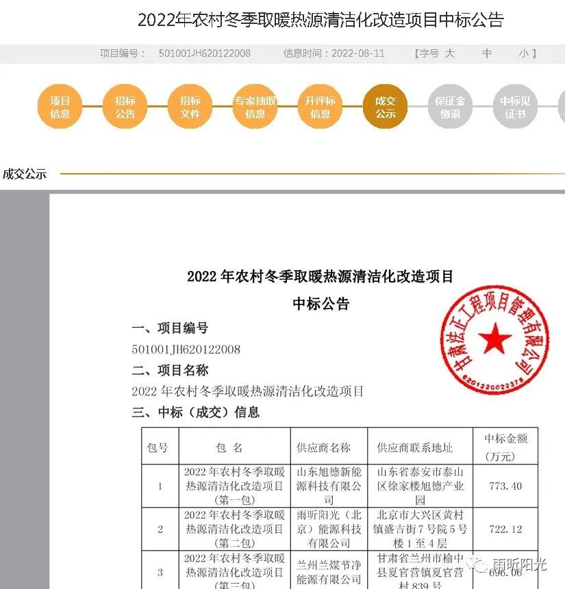 2022年8月11日,皋蘭縣發布2022年農村冬季取暖熱源清潔化改造項目中標公告,雨昕陽光中標第二標段太陽能+采暖項目,中標額722.12萬元。助力國家碳中和、碳達峰早日實現,雨昕陽光繼續貢獻自己的一份力量。