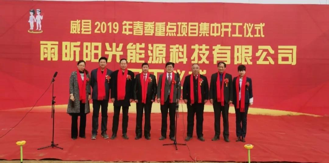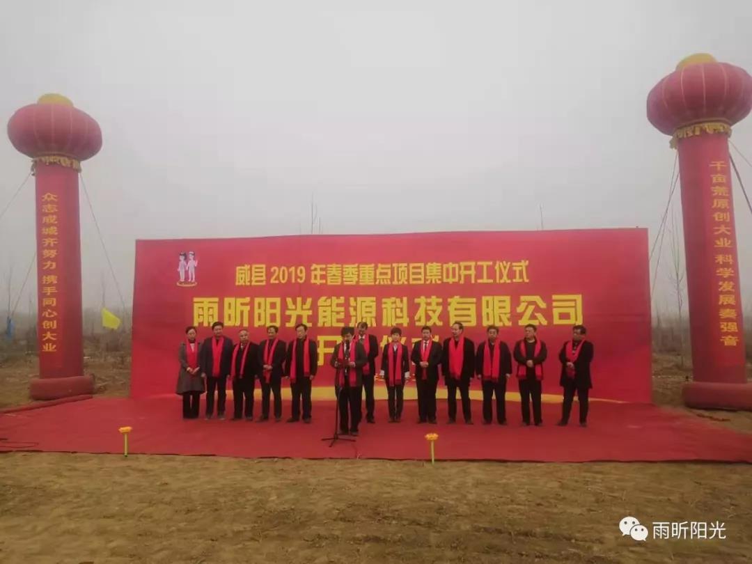 2019年2月22日上午,雨昕陽光能源科技有限公司項目奠基儀式于河省邢臺市威縣開發區新項目建設基地隆重舉行,雨昕陽光公司董事長孫培雨,總經理孫欽帥,以及公司行政部、財務部、工程部、生產部、項目部等相關負責人參加了本次儀式,同時蒞臨奠基儀式的嘉賓有威縣縣委、縣政府、侯貫鎮政府、縣直各單位的領導。