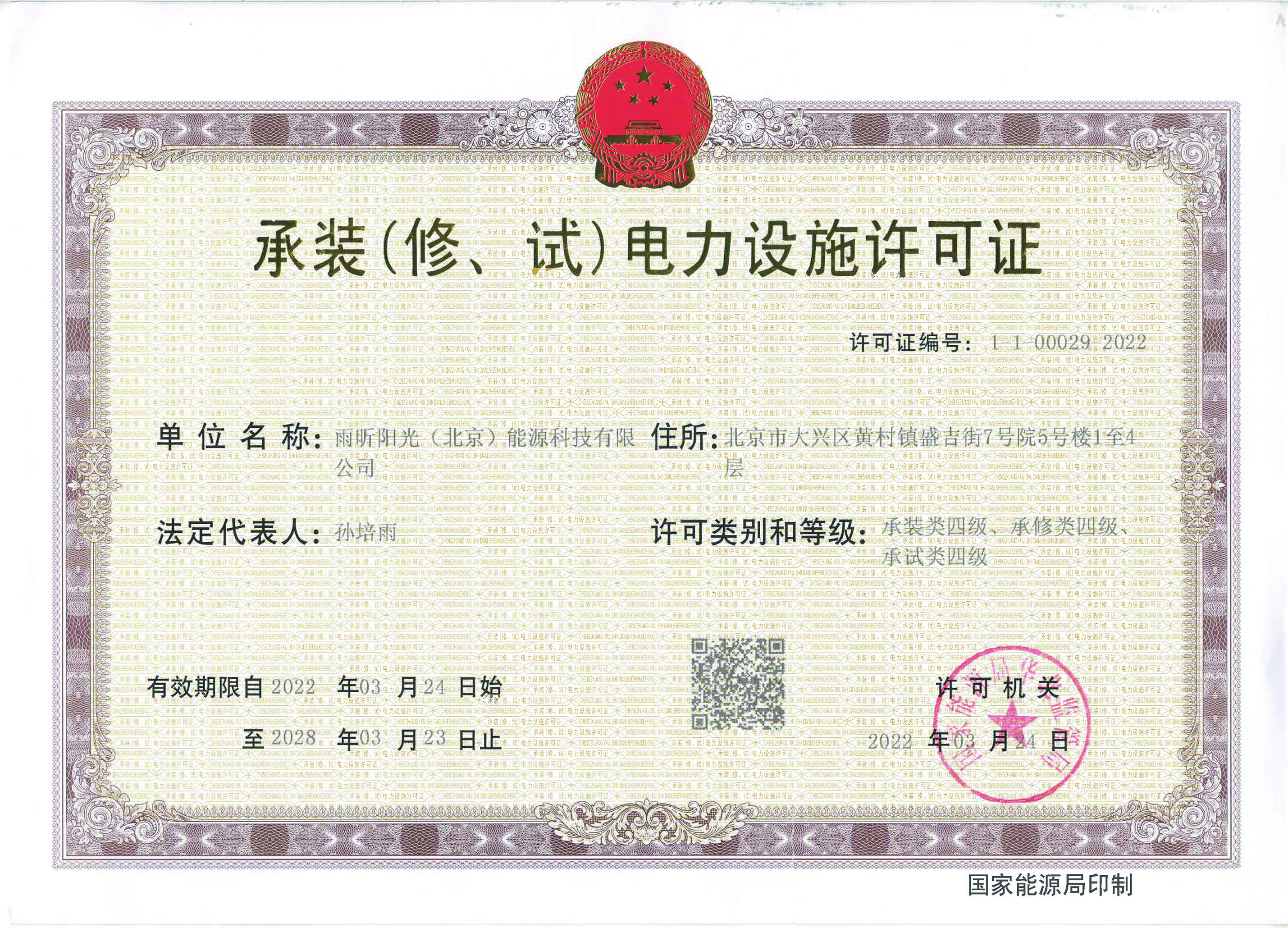 雨昕陽光(北京)能源科技有限公司成立于2000年,總部位于北京市大興區黃村開發區,總注冊資金10000.8萬元,是一家以太陽能光熱、光電、熱泵開發利用為主導,以清潔能源綜合服務為主體的高科技民營企業。響應國家碳排放政策,公司繼續推進光熱系統的同時,致力于光伏發電項目的開發利用。因此,雨昕陽光公司申請并獲得承裝電力設施許可證,為“碳達峰、碳中和”目標,繼續貢獻雨昕陽光力量。