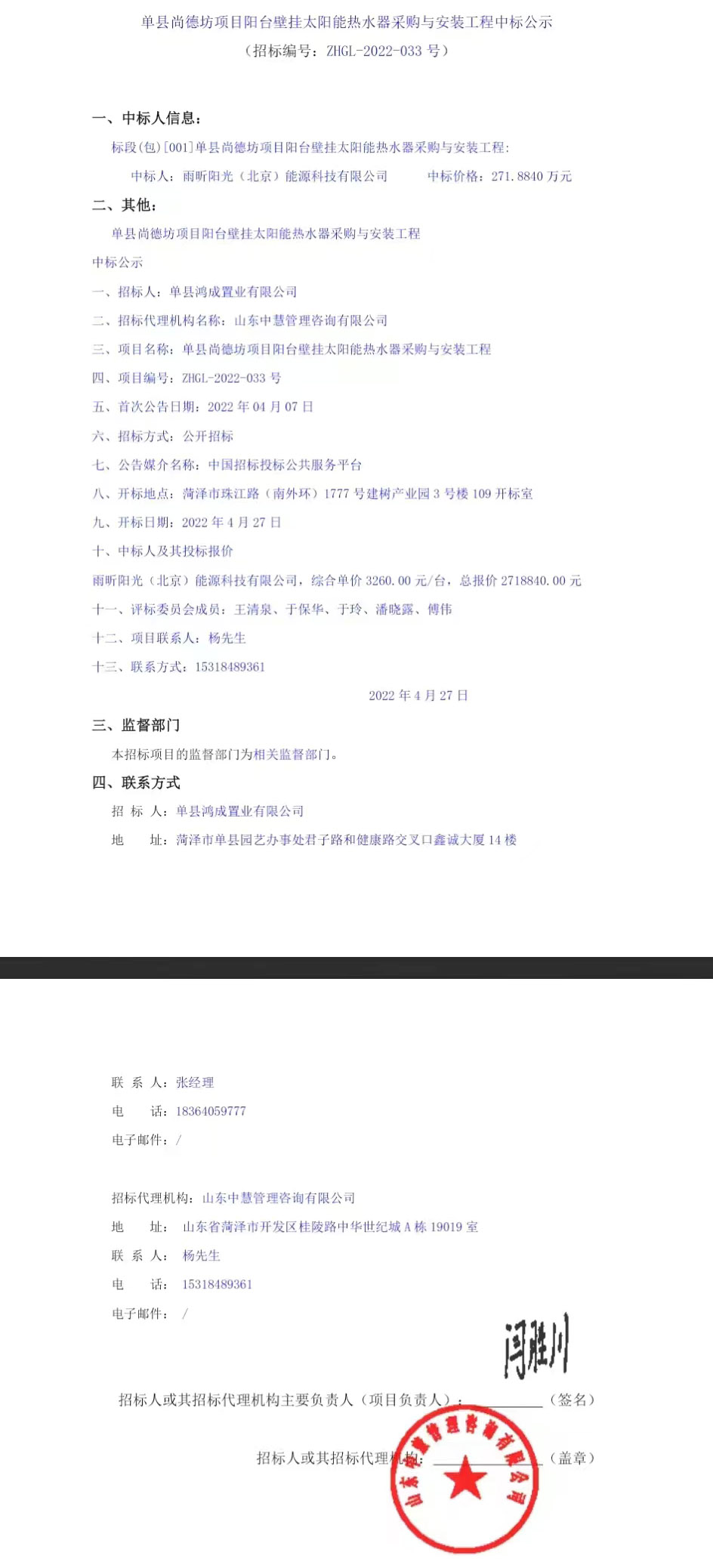 祝賀雨昕陽光中標單縣尚德坊太陽能熱水器采購與安裝工程