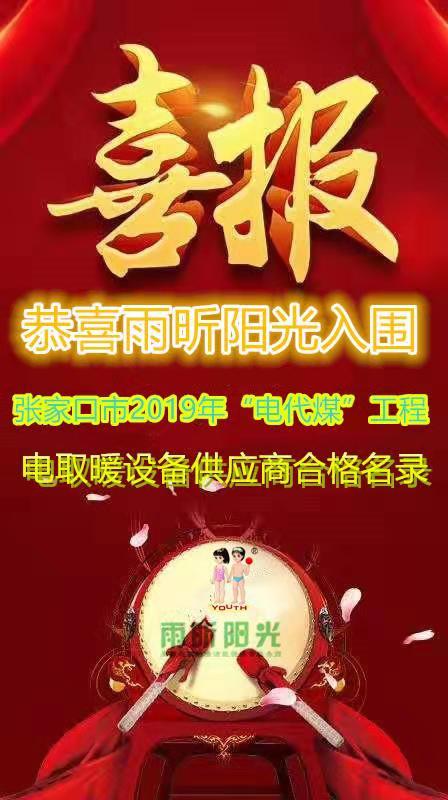 祝賀雨昕陽光入圍2019年“電代煤”工程電取暖設備供應商合格名錄