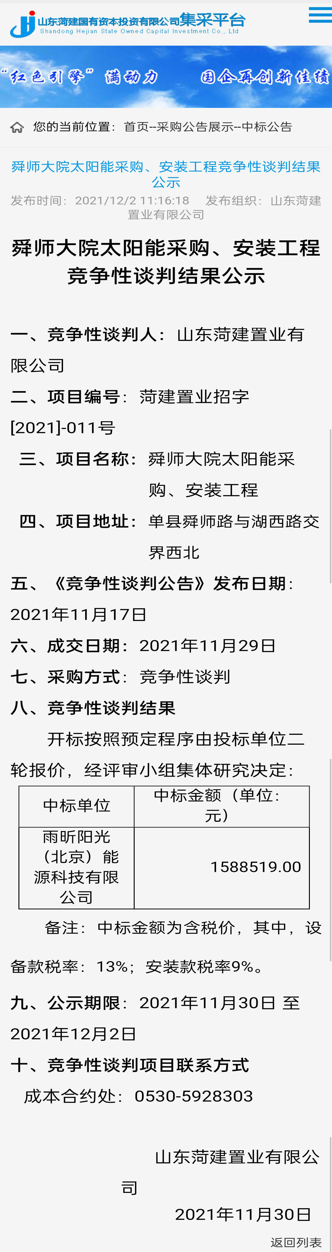 雨昕陽光中標單縣舜師大院太陽能采購、安裝工程